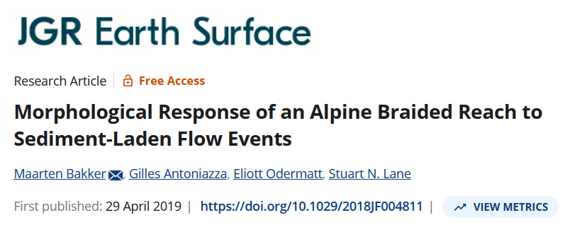 Bakker, M., Antoniazza, G., Odermatt, E., & Lane, S. N. (2019). Morphological response of an alpine braided reach to sediment‐laden flow events. Journal of Geophysical Research: Earth Surface, 124(5), 1310-1328.