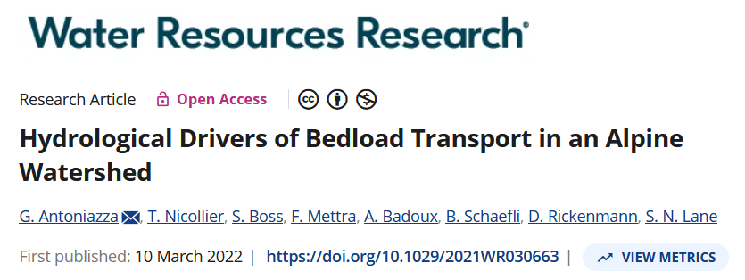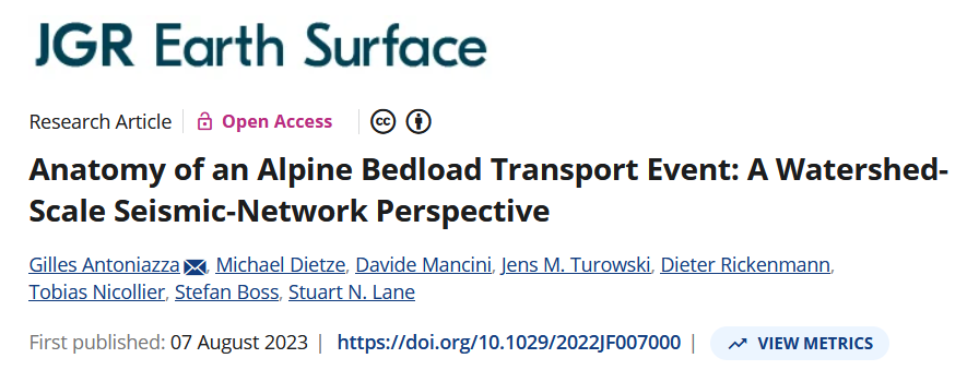 Antoniazza, G., Dietze, M., Mancini, D., Turowski, J. M., Rickenmann, D., Nicollier, T., … & Lane, S. N. (2023). Anatomy of an alpine bedload transport event: A watershed‐scale seismic‐network perspective. Journal of Geophysical Research: Earth Surface, 128(8), e2022JF007000.