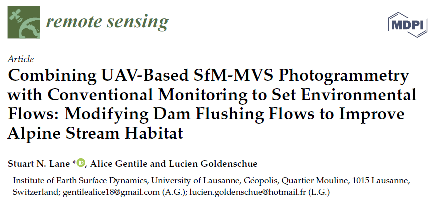 Lane, S. N., Gentile, A., & Goldenschue, L. (2020). Combining UAV-based SfM-MVS photogrammetry with conventional monitoring to set environmental flows: modifying dam flushing flows to improve alpine stream habitat. Remote Sensing, 12(23), 3868.