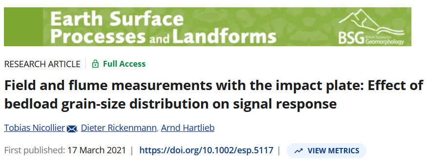 Nicollier, T., Rickenmann, D., & Hartlieb, A. (2021). Field and flume measurements with the impact plate: Effect of bedload grain‐size distribution on signal response. Earth Surface Processes and Landforms, 46(8), 1504-1520.