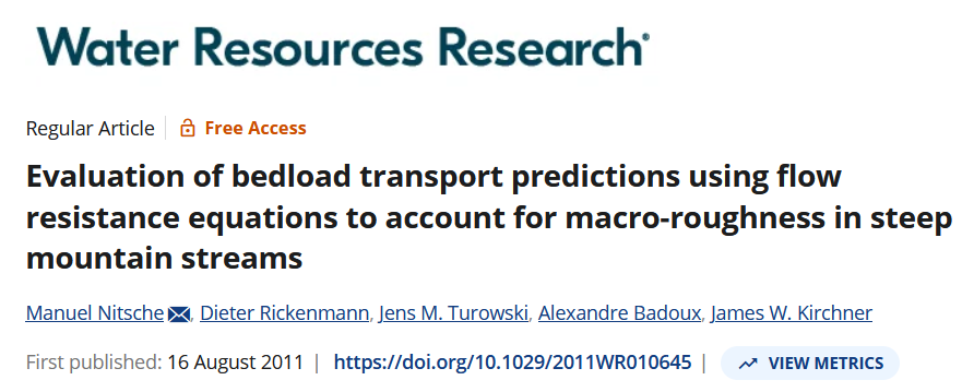 Nitsche, M., Rickenmann, D., Turowski, J. M., Badoux, A., & Kirchner, J. W. (2011). Evaluation of bedload transport predictions using flow resistance equations to account for macro‐roughness in steep mountain streams. Water Resources Research, 47(8).