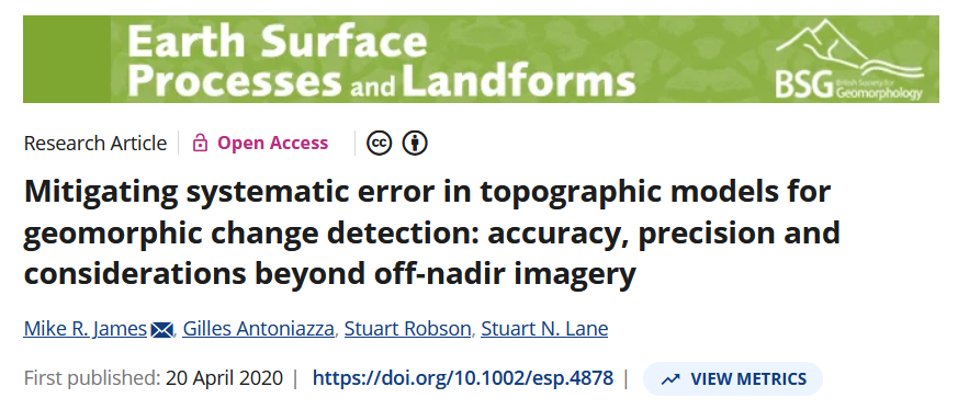 James, M. R., Antoniazza, G., Robson, S., & Lane, S. N. (2020). Mitigating systematic error in topographic models for geomorphic change detection: accuracy, precision and considerations beyond off‐nadir imagery. Earth Surface Processes and Landforms, 45(10), 2251-2271.