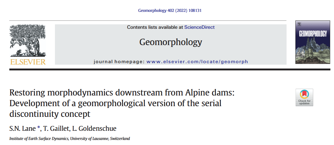 Lane, S. N., Gaillet, T., & Goldenschue, L. (2022). Restoring morphodynamics downstream from Alpine dams: development of a geomorphological version of the serial discontinuity concept. Geomorphology, 402, 108131.