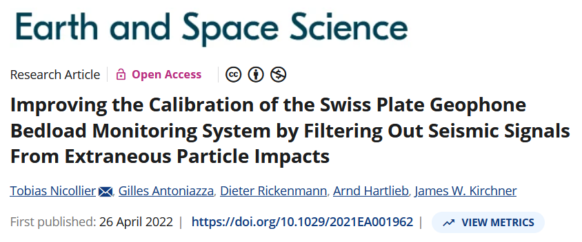Nicollier, T., Antoniazza, G., Rickenmann, D., Hartlieb, A., & Kirchner, J. W. (2022). Improving the calibration of the Swiss plate geophone bedload monitoring system by filtering out seismic signals from extraneous particle impacts. Earth and Space Science, 9(5), e2021EA001962.