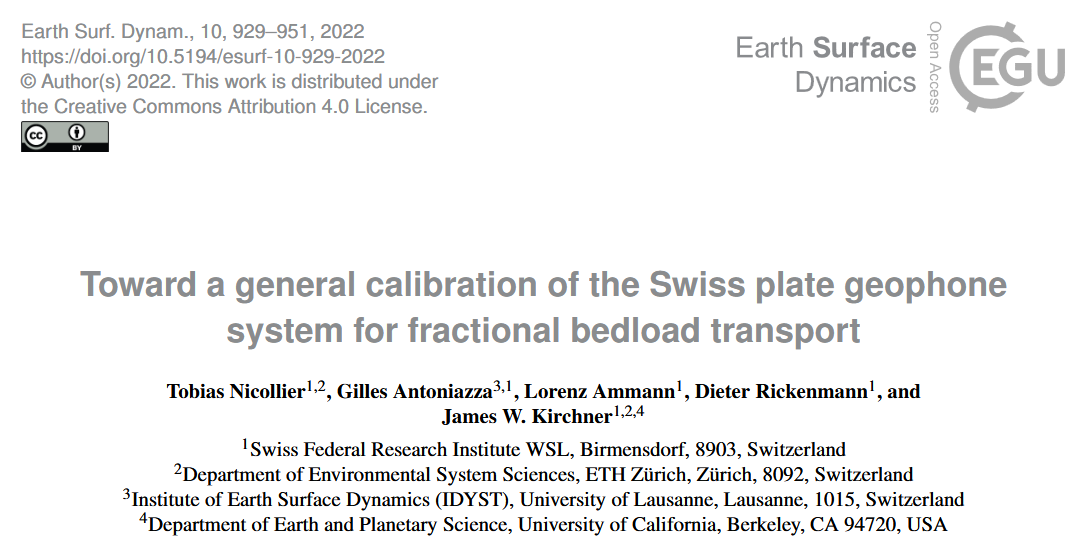 Nicollier, T., Antoniazza, G., Ammann, L., Rickenmann, D., & Kirchner, J. W. (2022). Toward a general calibration of the Swiss plate geophone system for fractional bedload transport. Earth Surface Dynamics, 10(5), 929-951.