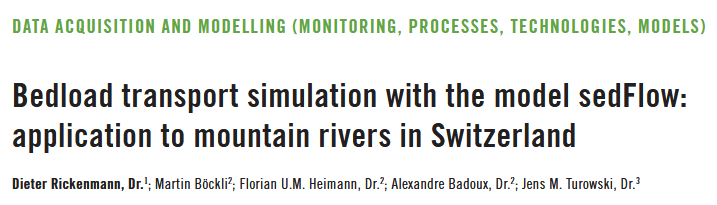 Rickenmann, D., Böckli, M., Heimann, F.U.M., Badoux, A., Turowski, J.M. (2016): Bedload transport simulation with the model sedFlow: application to mountain rivers in Switzerland. In: Koboltschnig, G. (ed) 13th Congress Interpraevent 2016. 30 May to 2 June 2016, Lucerne, Switzerland. Conference Proceedings. Living with natural risks. Luzern, International Research Society Interpraevent. 387-395.