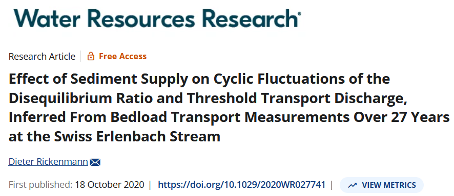 Rickenmann, D. (2020). Effect of sediment supply on cyclic fluctuations of the disequilibrium ratio and threshold transport discharge, inferred from bedload transport measurements over 27 years at the Swiss Erlenbach stream. Water Resources Research, 56(11), e2020WR027741.