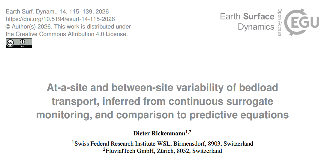 Rickenmann, D. (2026). At-a-site and between-site variability of bedload transport, inferred from continuous surrogate monitoring, and comparison to predictive equations. Earth Surface Dynamics, 14(1), 115-139.