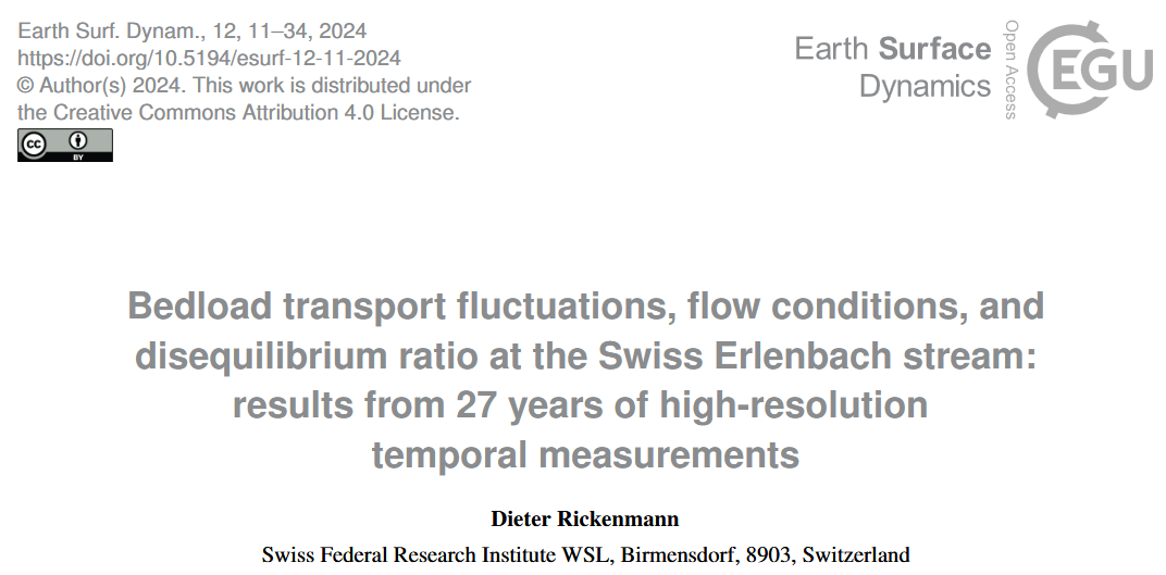 Rickenmann, D. (2024). Bedload transport fluctuations, flow conditions, and disequilibrium ratio at the Swiss Erlenbach stream: results from 27 years of high-resolution temporal measurements. Earth Surface Dynamics, 12(1), 11-34.