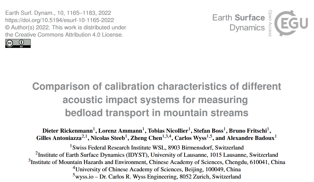 Rickenmann, D., Ammann, L., Nicollier, T., Boss, S., Fritschi, B., Antoniazza, G., … & Badoux, A. (2022). Comparison of calibration characteristics of different acoustic impact systems for measuring bedload transport in mountain streams. Earth Surface Dynamics, 10(6), 1165-1183.