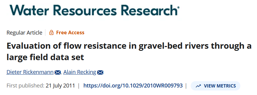 Rickenmann, D., & Recking, A. (2011). Evaluation of flow resistance in gravel‐bed rivers through a large field data set. Water Resources Research, 47(7).