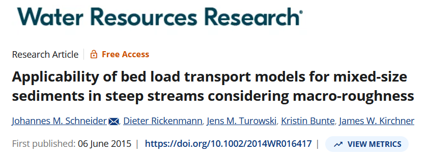 Schneider, J. M., Rickenmann, D., Turowski, J. M., Bunte, K., & Kirchner, J. W. (2015). Applicability of bed load transport models for mixed‐size sediments in steep streams considering macro‐roughness. Water Resources Research, 51(7), 5260-5283.