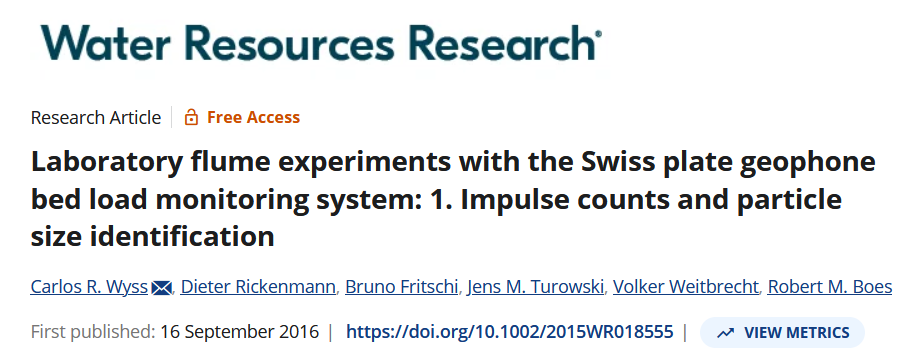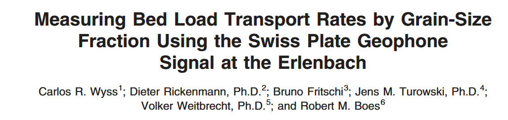 Wyss, C. R., Rickenmann, D., Fritschi, B., Turowski, J. M., Weitbrecht, V., & Boes, R. M. (2016). Measuring bed load transport rates by grain-size fraction using the Swiss plate geophone signal at the Erlenbach. Journal of Hydraulic Engineering, 142(5), 04016003.
