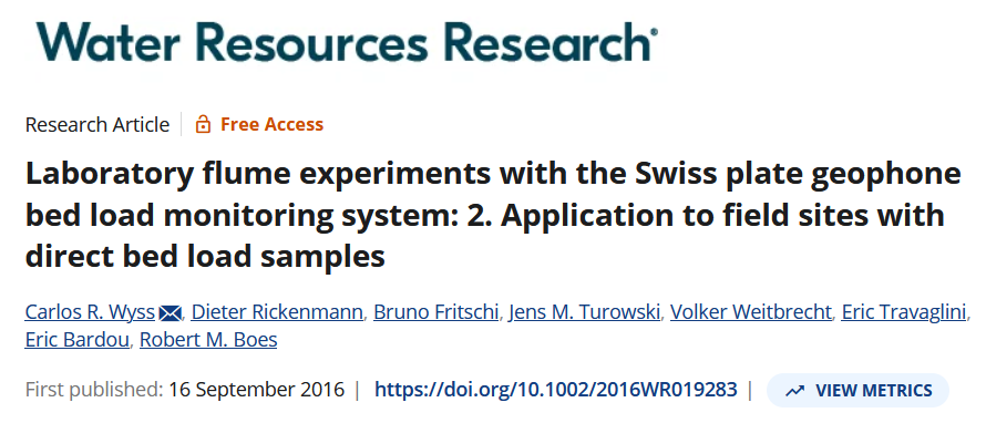 Wyss, C. R., Rickenmann, D., Fritschi, B., Turowski, J. M., Weitbrecht, V., Travaglini, E., … & Boes, R. M. (2016). Laboratory flume experiments with the S wiss plate geophone bed load monitoring system: 2. Application to field sites with direct bed load samples. Water Resources Research, 52(10), 7760-7778.